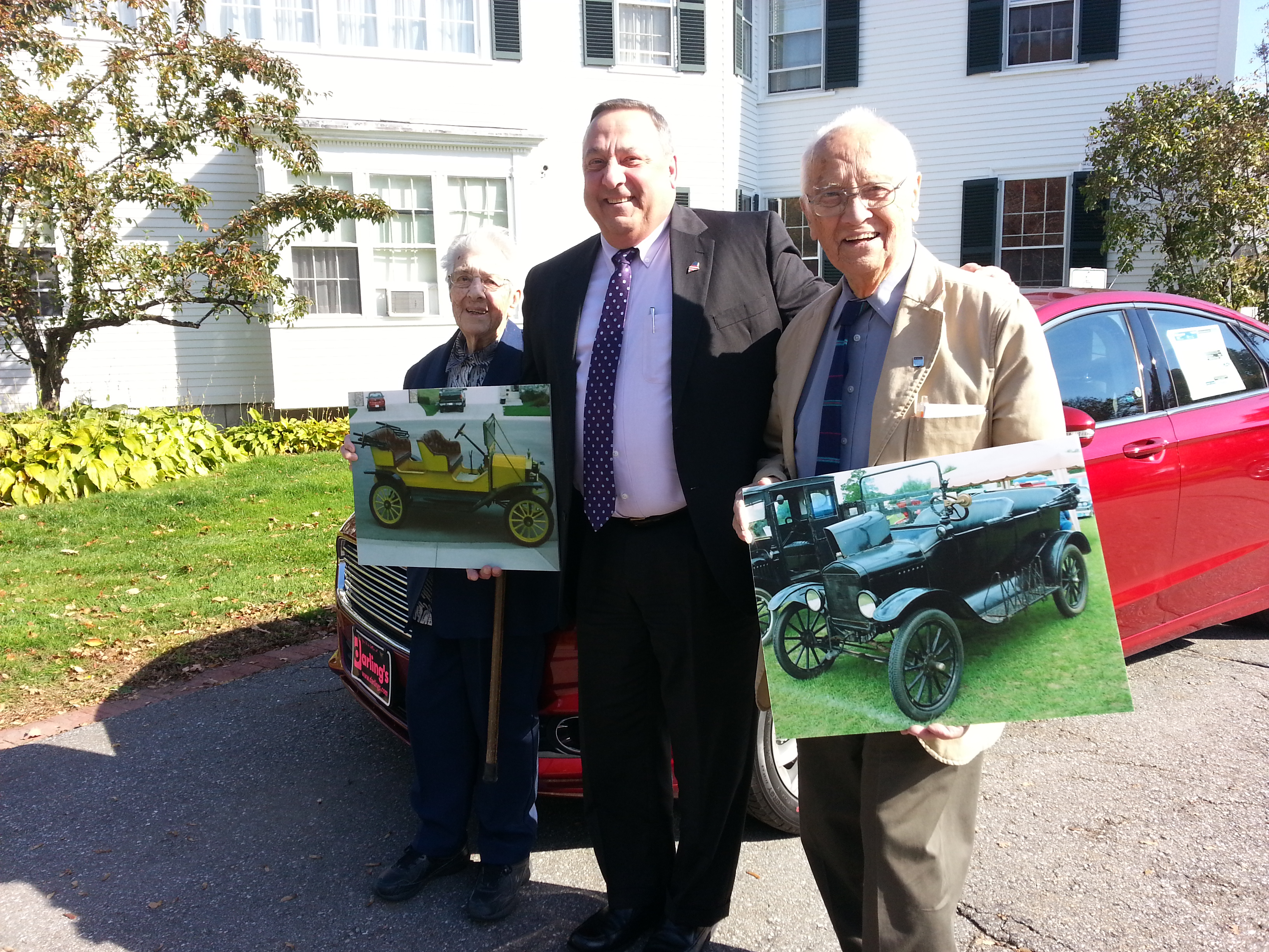 Here's a great photo of Dick with Clara Swan and Former Governor Paul LePage. Clara and Dick are holding photos of popular automobiles from their birth years! Click to enlarge.